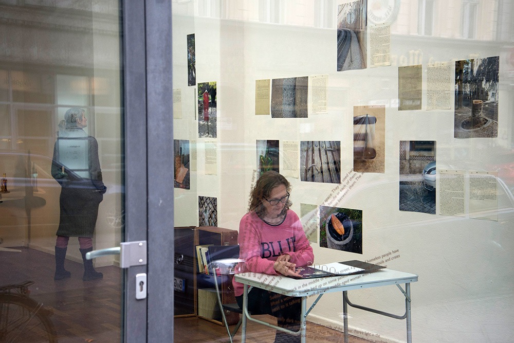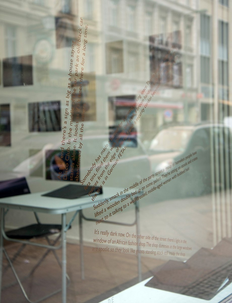 The joint exhibition by Mette Kit Jensen and C.Y. Frostholm, WRITING WHILE WALKING, at SCOTTY is a dialog between ways of reading and writing the city. From opposite corners of Europe the two Danish visual artists are approaching public space sideways and flaneuring.