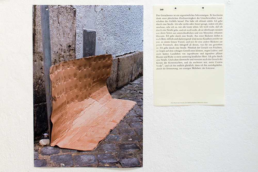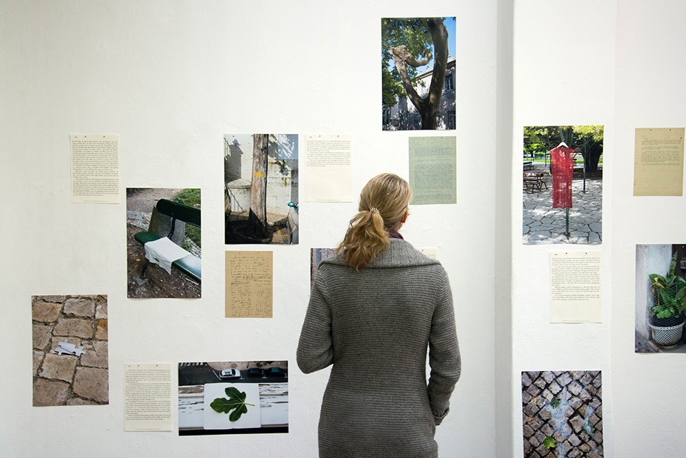 C.Y. Frostholm‘s photo and text installation Model for a mobile library takes a cypress tree on a square in Lisbon as its starting point. The tree that is mentioned in a guidebook by the Portuguese poet Fernando Pessoa was once used as a public library, and threads are drawn between the city’s tradition for transportable libraries, Pessoa‘s many personas and addresses, and an attempt to do urban botanics.